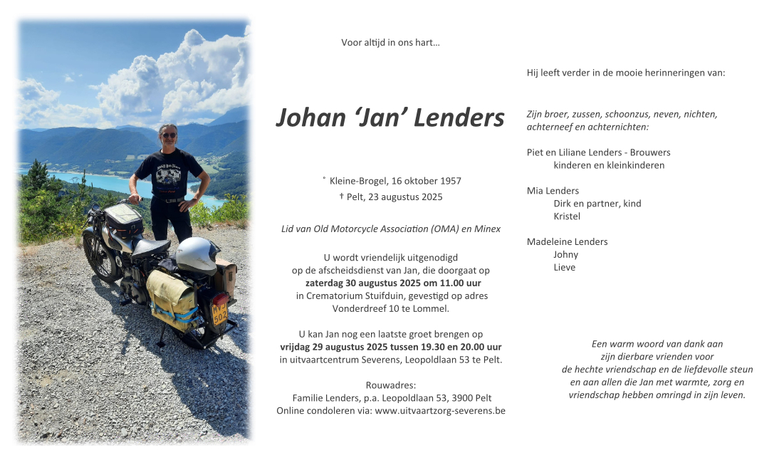 De familie laat weten het wel te appreciëren mochten er zaterdag 30 augustus een aantal oude motoren bij de dienst aanwezig zijn.